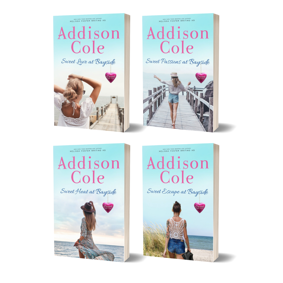 Sweet Passions at Bayside is a Sweet with Heat novel and conveys all of the passion you’d expect to find between two people in love without any graphic scenes or harsh language. If you’re looking for a more explicit romance, pick up the steamy edition, Bayside Passions, written by New York Times bestselling author Melissa Foster. Addison Cole is Melissa’s sweet-romance pen name.